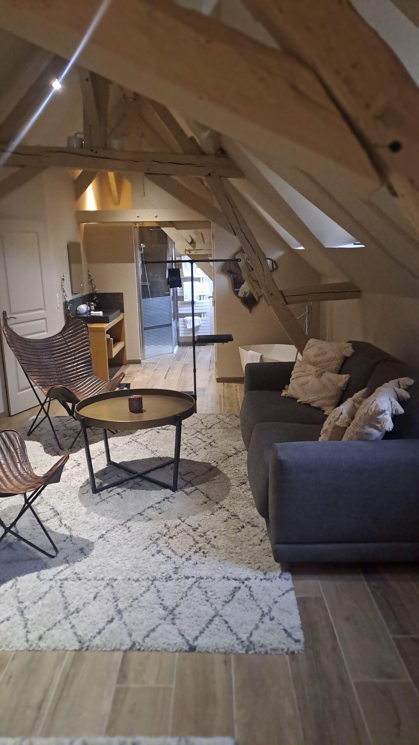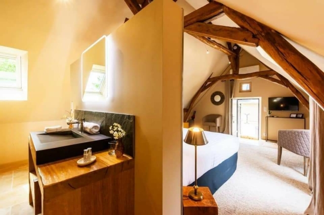 - d’une salle de bain privée avec vasque en pierre naturelle et douche en ardoise
